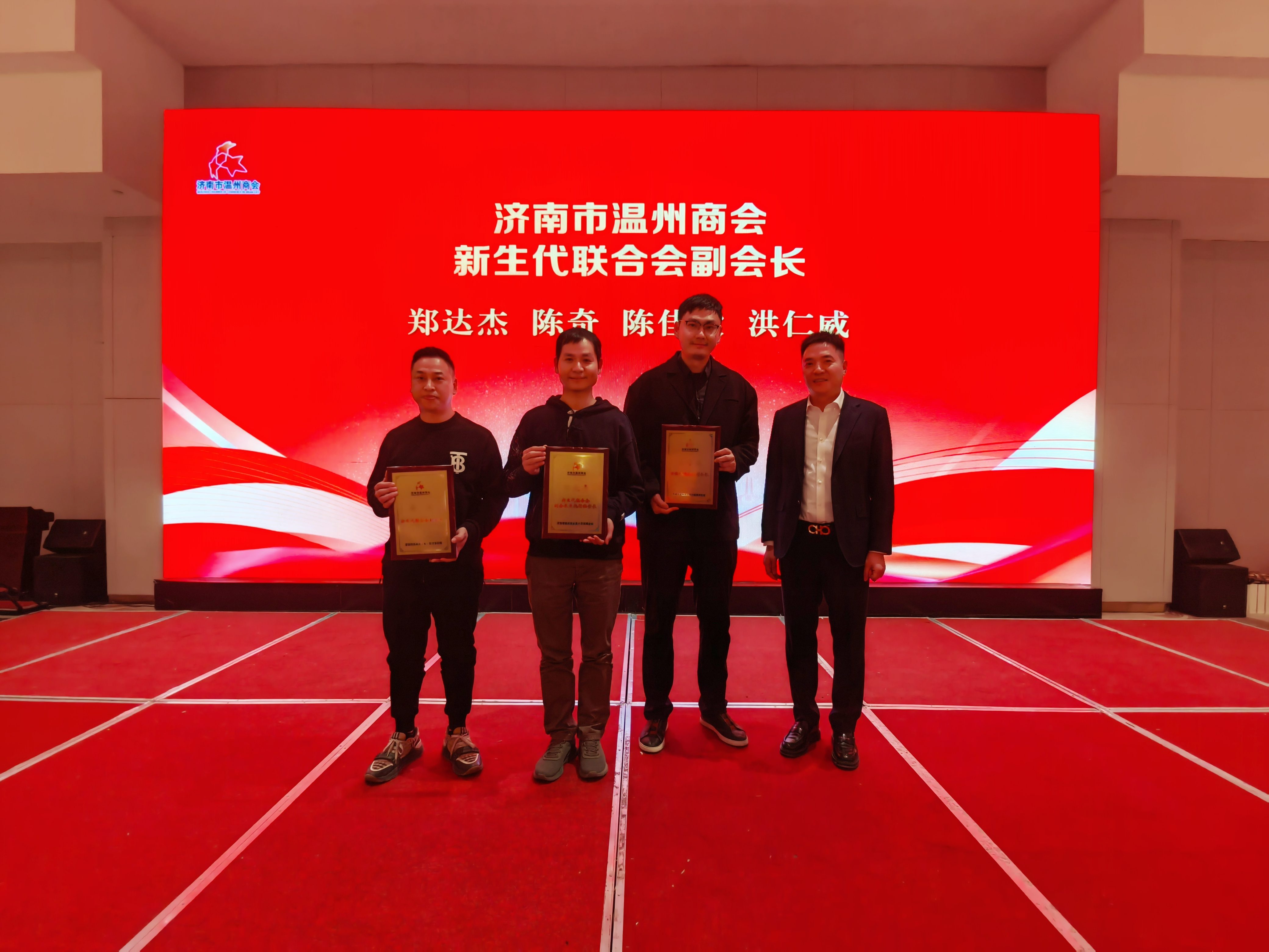 常务副会长兼新生代温商联合会会长王利为新生代温商联合会副会长兼执行秘书长郑达杰,副会长陈奇、陈佳毅、洪仁威颁牌