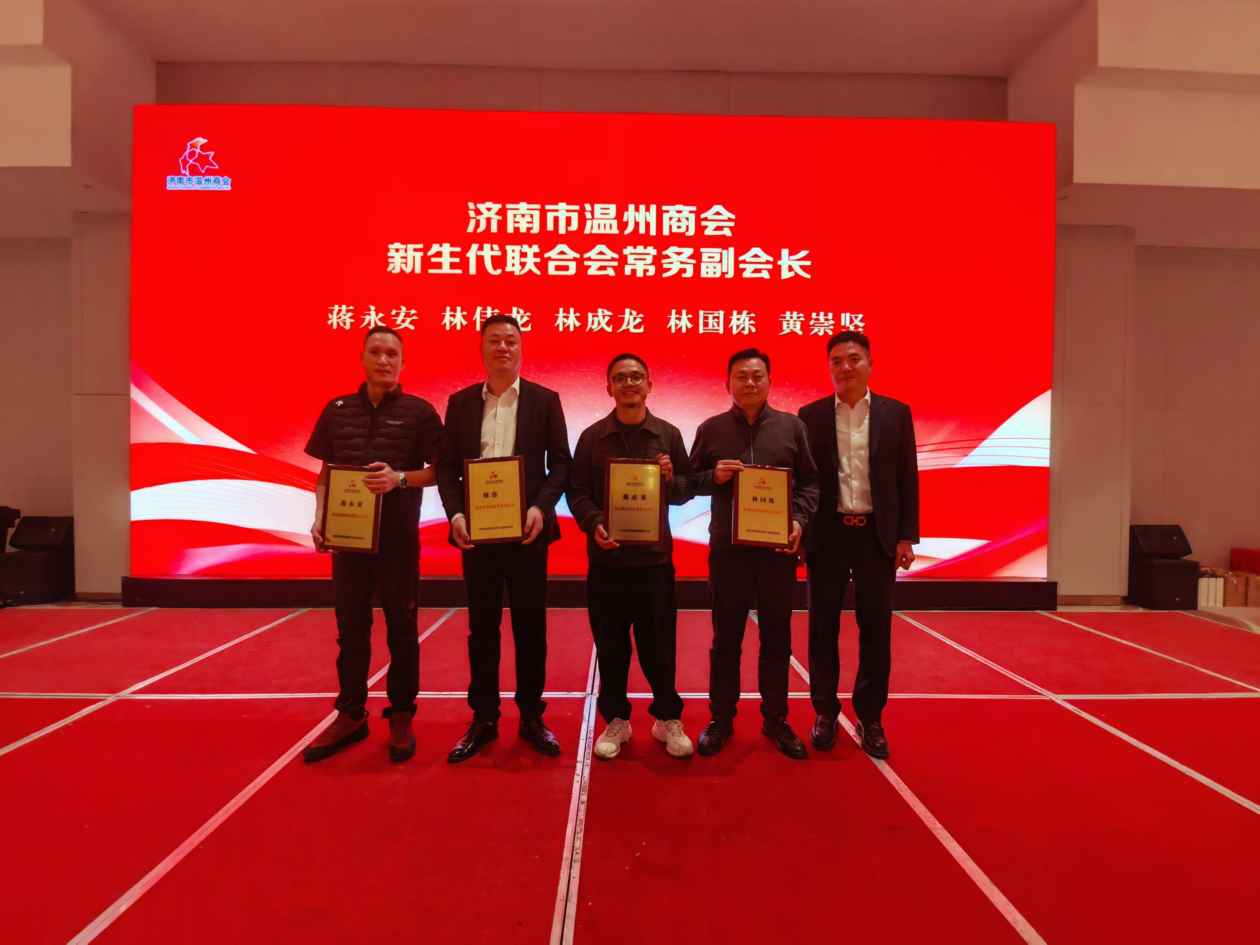 常务副会长兼新生代温商联合会会长王利为新生代温商联合会常务副会长蒋永安、林伟龙、林成龙、林国栋、黄崇坚颁牌